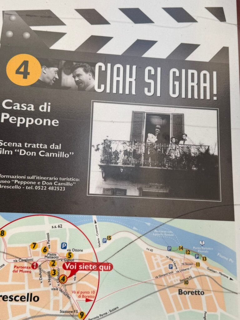 E proprio con la visita a Brescello inizierà la nostra giornata :“quel paesino” adagiato lungo le sponde del Grande Fiume nella Bassa Reggiana, un vero e proprio set a cielo aperto, dove pare ancora di sentire l’eco delle liti tra il focoso sindaco Peppone e lo spumeggiante parroco Don Camillo. Il Museo Peppone e Don Camillo consente di ripercorrere le loro avventure attraverso oggetti di scena, locandine, manifesti originali, fotografie dai set ecc. Da non perdere anche una tappa al “Museo Brescello e Guareschi, Il territorio e cinema”, che al suo primo piano propone ai visitatori la ricostruzione di un set cinematografico originale dei film.
