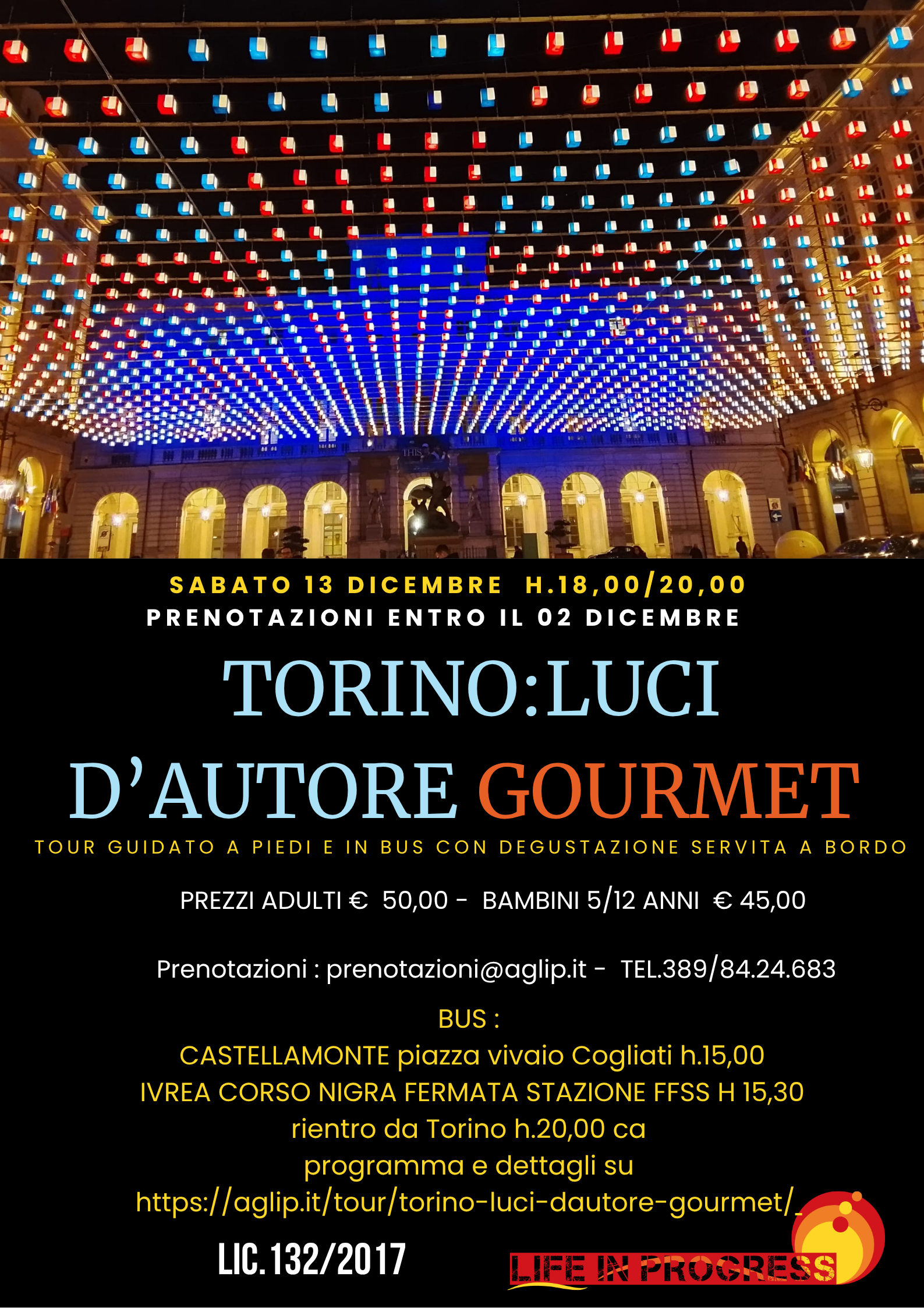 Un preserale d’autore con degustazione di prodotti dell’eccellenza canavesana serviti a bordo per saziare il pancino nell’ora della cena e gustare al meglio la Capitale Sabauda illuminata ad arte con la magia delle luci natalizie che la rendono, se possibile, ancora piu’ magica.